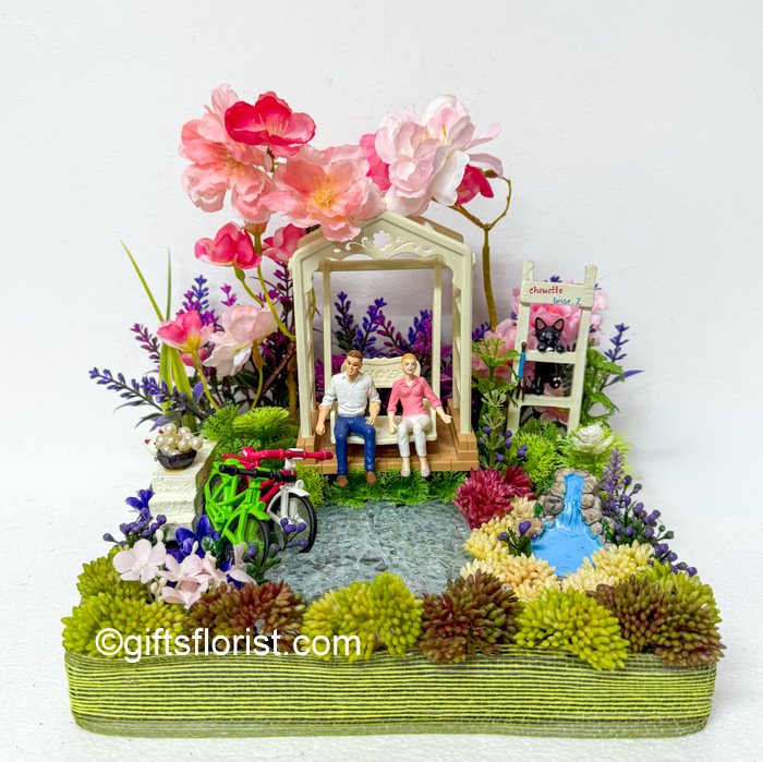 A charming mini garden scene featuring a couple relaxing on a swing, surrounded by vibrant blooms, bicycles, and a tiny waterfall. This handcrafted décor piece brings warmth and romance, making it a unique gift for anniversaries, weddings, or simply to brighten any space. Base approx. 22cm × 22cm.
