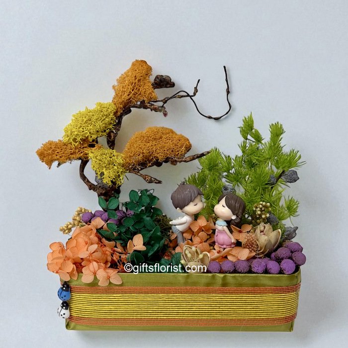 A charming handcrafted miniature landscape featuring a loving couple surrounded by colorful preserved blooms, soft moss, and natural twigs. The mix of warm orange, lush green, and gentle purple tones creates a dreamy garden scene that symbolizes affection and togetherness. Perfect as a romantic keepsake or a heartfelt gift for anniversaries, weddings, or home décor.