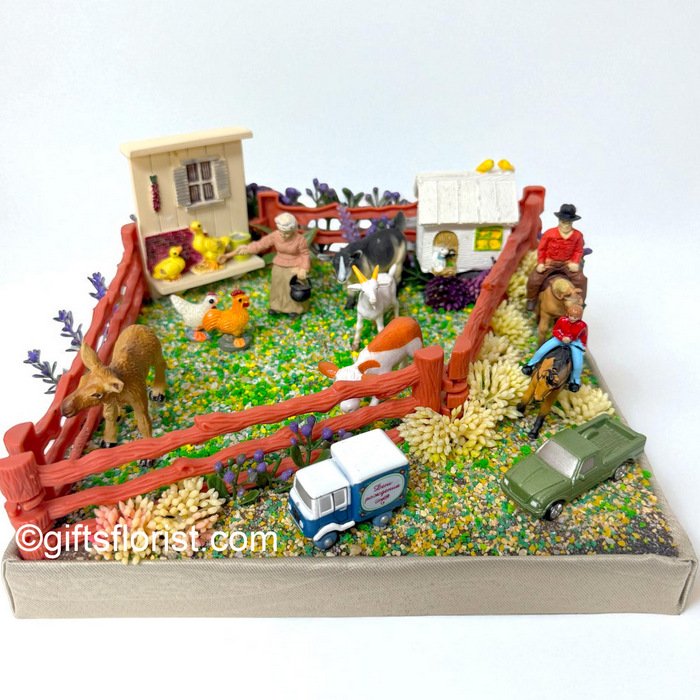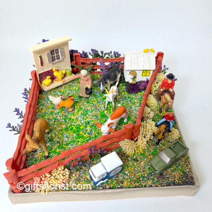 Step into the charm of rural living with this detailed farmyard diorama. Complete with farmer, animals, barn, fencing, delivery truck, and horse riders, every corner tells a story of farm life. Hand-crafted with colorful accents, it makes a delightful gift or décor piece for collectors and nature lovers. Approx. base size 22cm × 22cm.