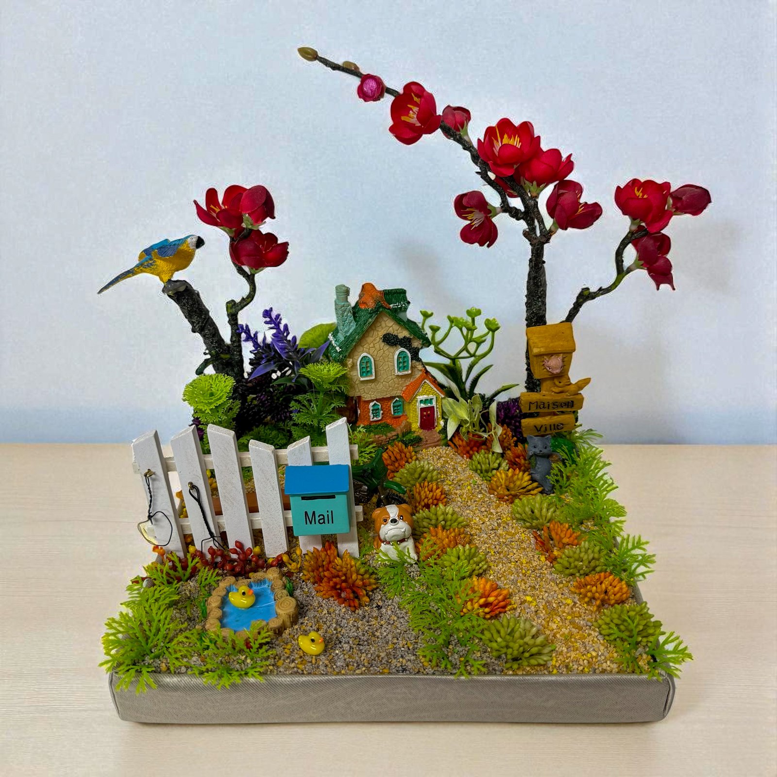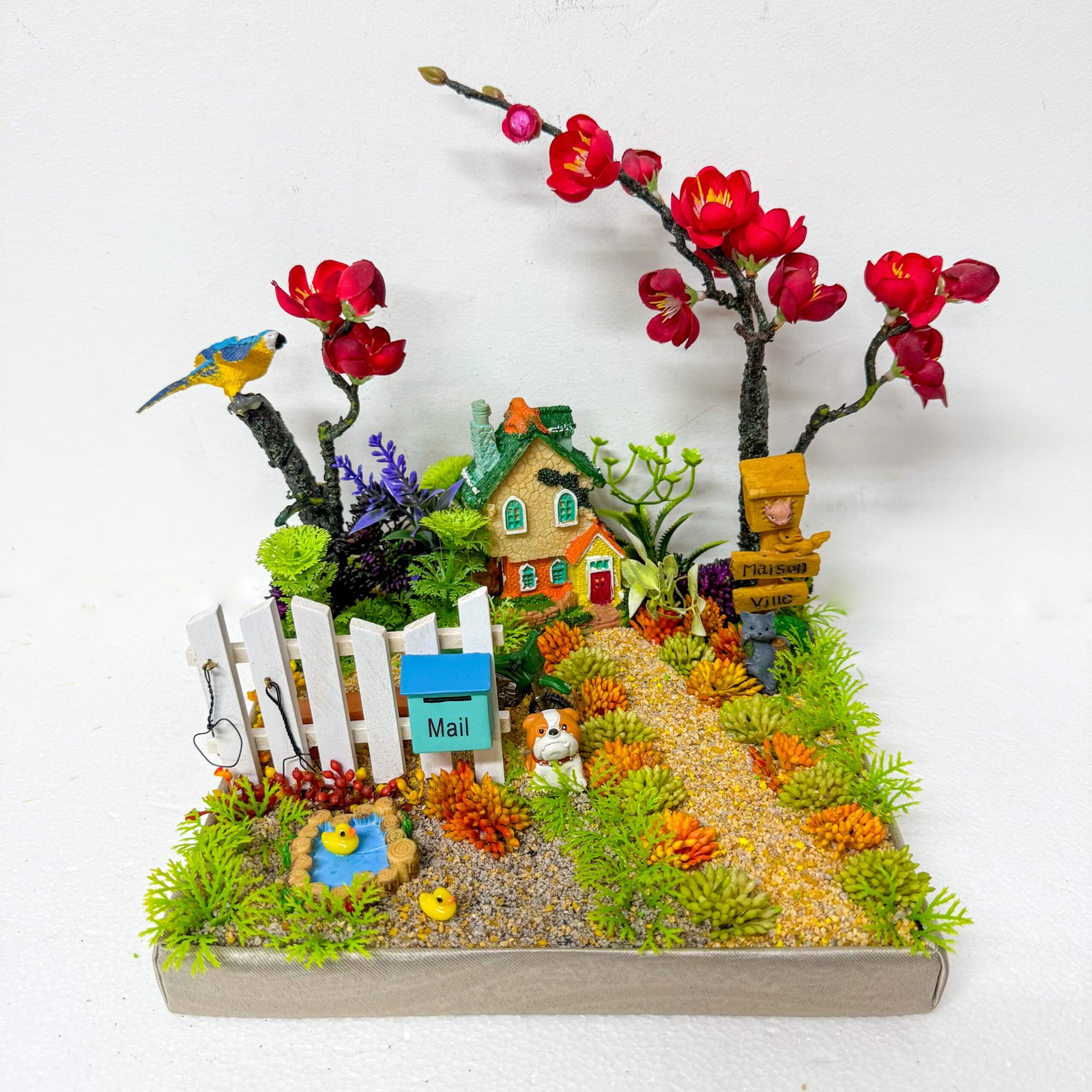 Step into a charming countryside garden with this handcrafted diorama. Featuring a cozy cottage, white picket fence with mailbox, playful puppy, pond with ducks, blossoming trees, and a bird perched above, it paints a delightful picture of homely warmth and nature’s beauty. A thoughtful gift and a unique décor piece for collectors and nature lovers.